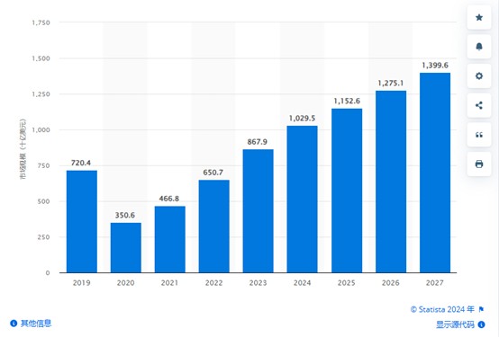 全球數據和商業智能平台Statista數據顯示,預計到2027年,全球康養旅遊市場規模將達到約1.4萬億美元,與2022年的6500億美元相比,增幅超過100%。