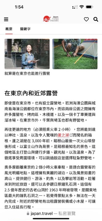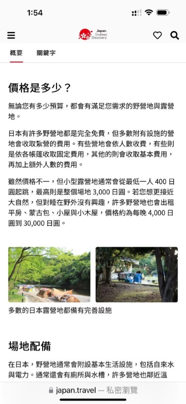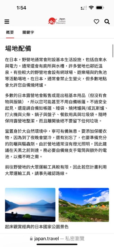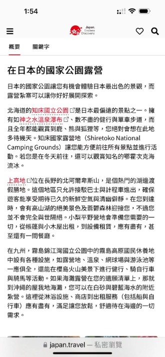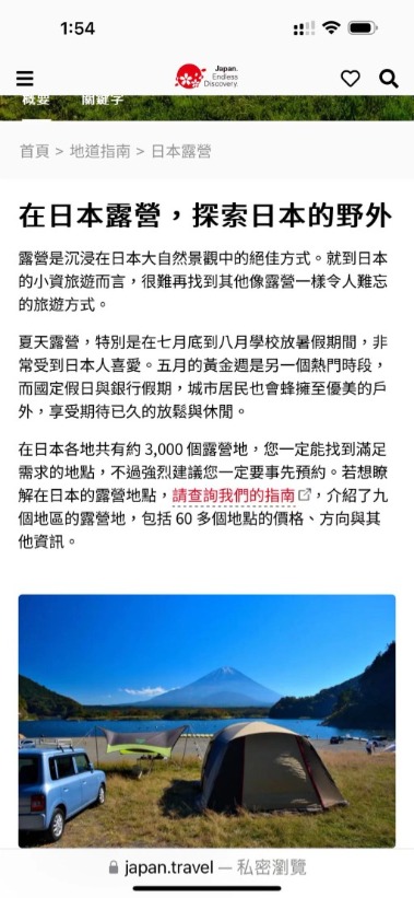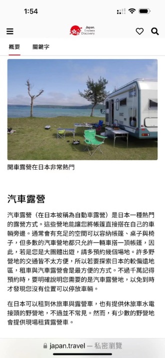 而日本觀光局,更為了要推廣露營,設立精緻多國語言的國際網站(如下圖),全力推廣及介紹日本的露營區,以吸引更多的國際觀光人潮。