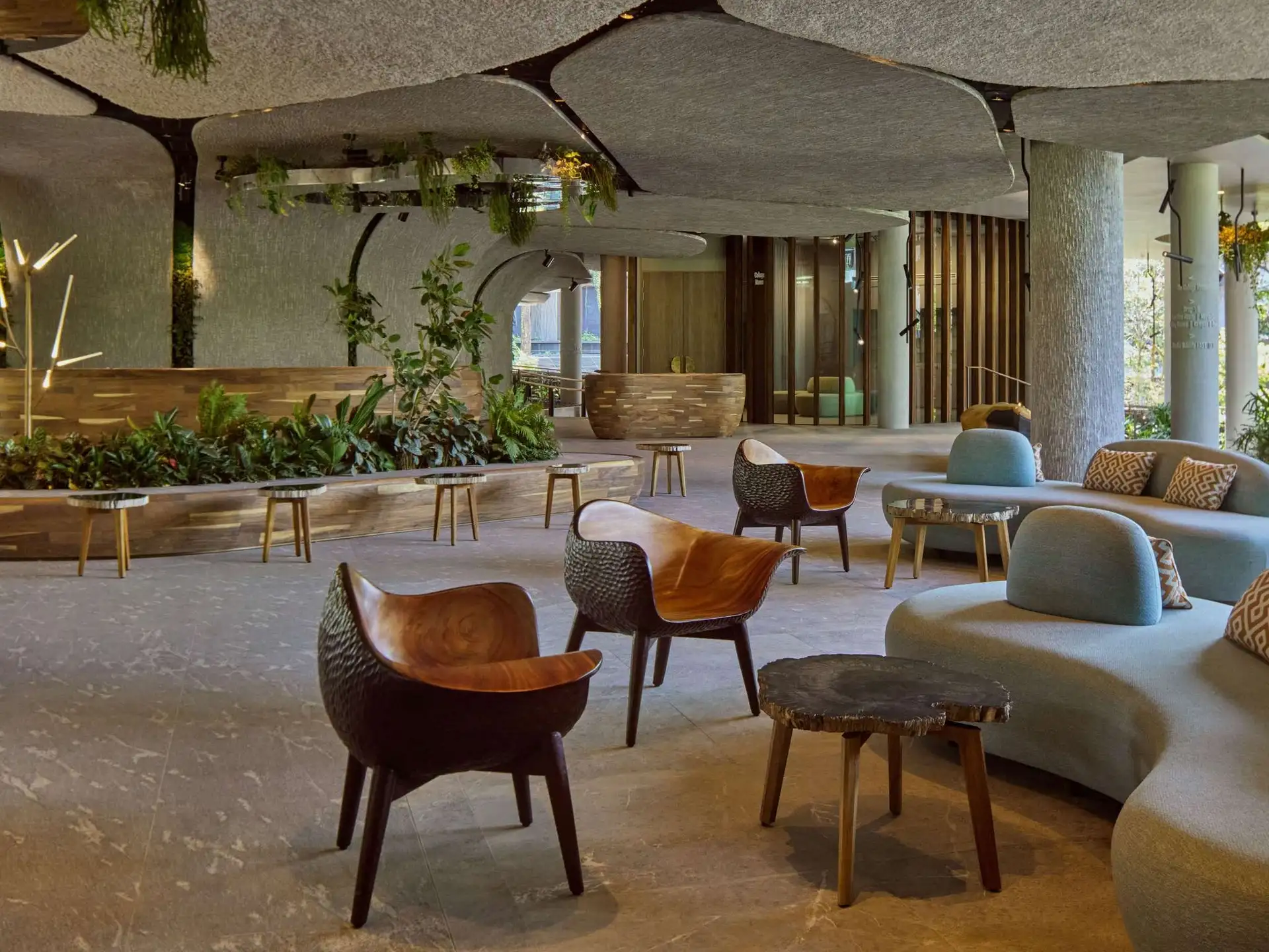 整個建築採用垂直生態系統設計,模仿雨林生物的群落分布,自然、動物真正實現和諧共存。漫步在酒店的迴廊、步道,隨處可見的是鬱鬱蔥蔥的綠色植被,彷彿置身於一片真正的雨林叢林中。而對可持續理念的踐行和生物親和理念的應用也滲透於建築的肌理之中。整體建築多採用低碳足跡、環保材料,在可持續性、耐用性和可回收性都提出了很高的要求。建築立面使用了回收的樹皮進行混凝土印模,形成了獨一無二、模仿自然樹皮質感的紋理。這種對細節的執著,讓建築彷彿是從雨林中生長出來的一般,而非生硬地闖入。