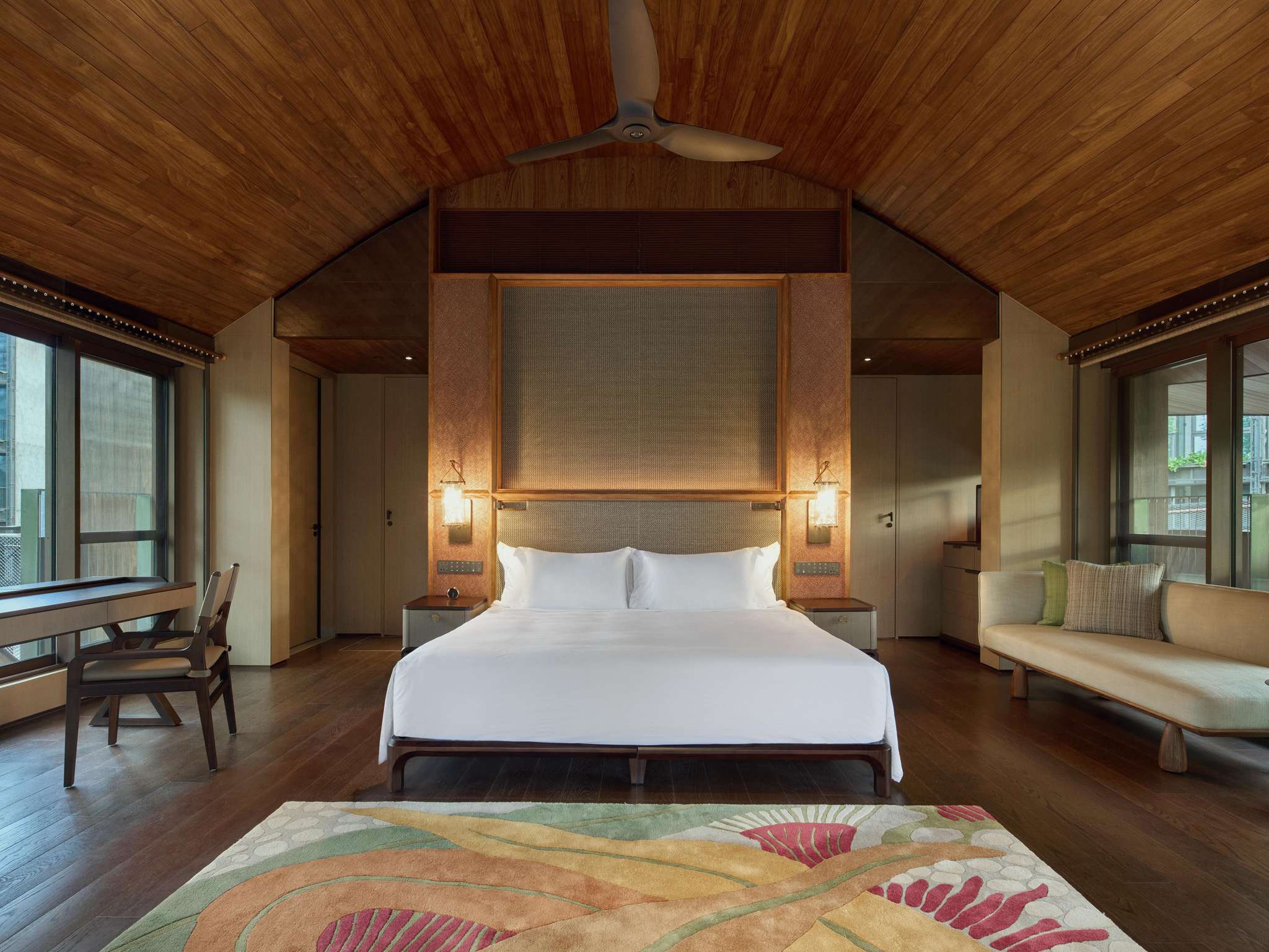 338間客房,其中314間客房及套房位於主樓之中,彷彿雨林樹杈的枝葉般規律排列。24座樹屋,則位於主樓之外,像是延伸而出的花朵,從紫花槐的種子莢汲取靈感,與雨林的垂直生態層次相呼應。