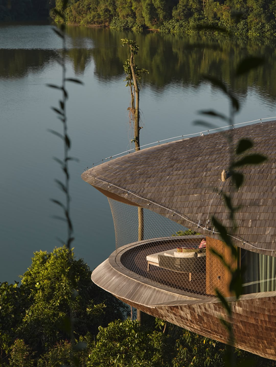 主樓客房彷彿懸浮於雨林樹冠之中,窗外是滿目的綠意或水庫的波光。在室內設計上,並非簡單粗暴地融入「雨林元素」,而是以更加藝術和可持續的方式致敬自然。