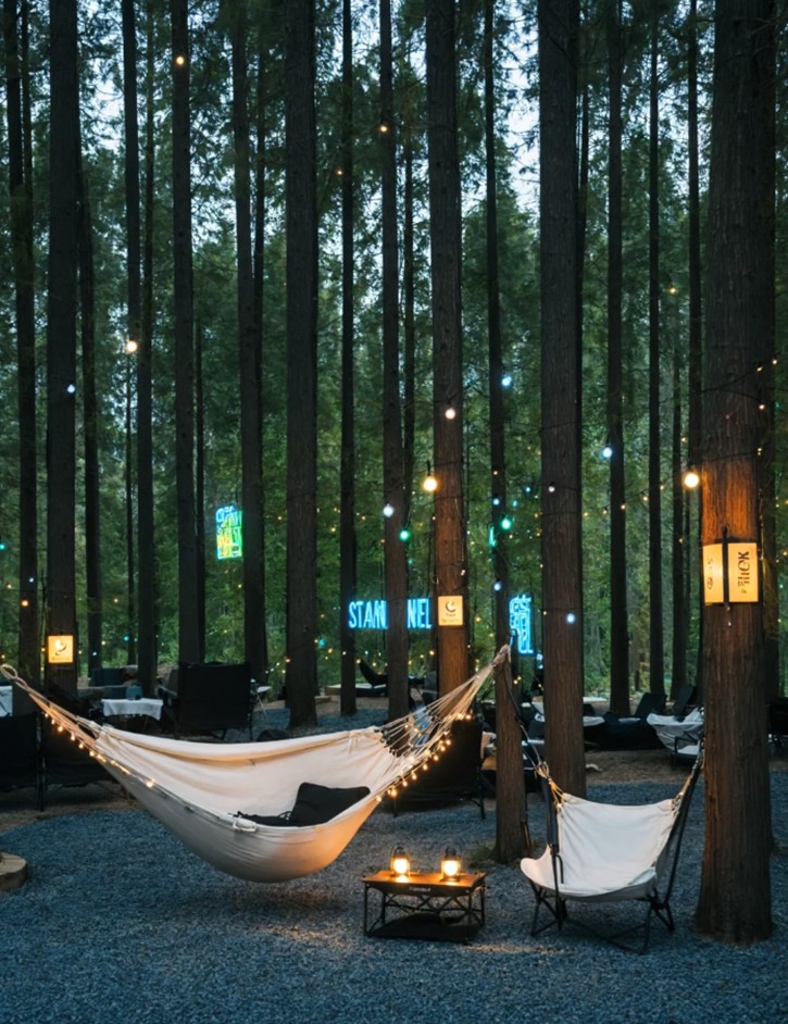 場景敘事化設計: 每個空間都是故事舞台——篝火是社交敘事,獨處區是冥想敘事,親子區是探索敘事。
